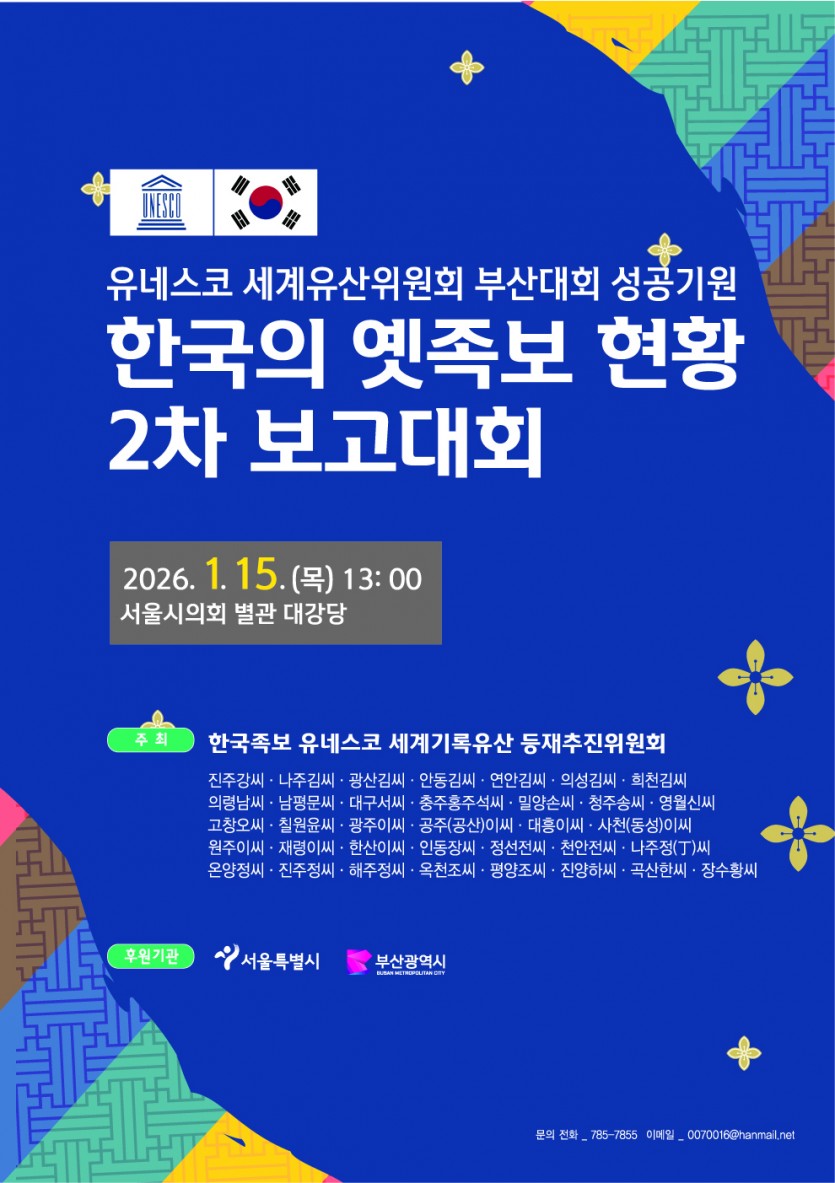 유네스코.. 한국 옛족보현황 2차 보고대회 안내 팜플렛 페이지 정보 작성자 휴휴재 댓글 0건 조회 28회 작성일 26-01-10 03:20 목록 본문 유네스코.. 한국 옛족보현황 2차 보고대회 안내 팜플렛 이전글사천(동성)이씨사총람의 국립중앙도서관 서지정보 변경 요구 26.01.10 다음글대종회 임원을 부분 수정 하였습니다. 26.01.09 댓글 0 댓글목록 등록된 댓글이 없습니다.
