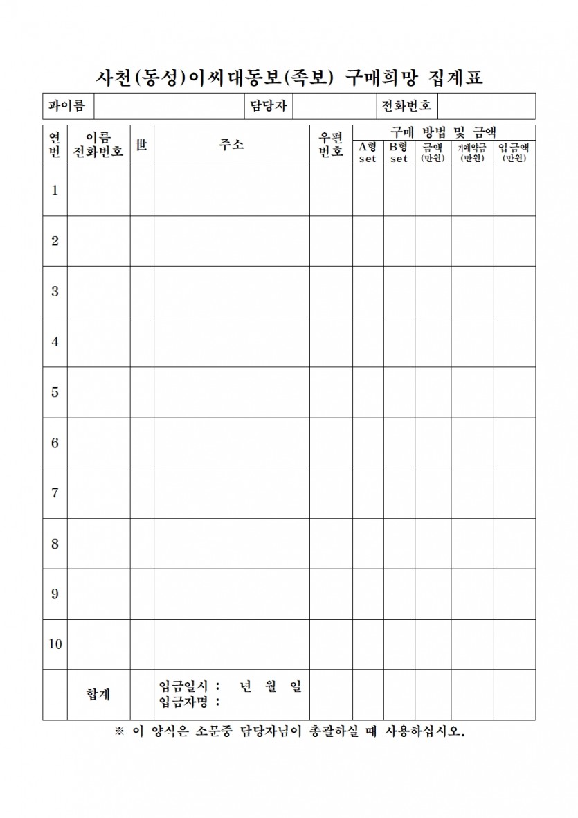 사천(동성)이씨대동보(족보) 구매희망 집계표 - 소문중 담당자용